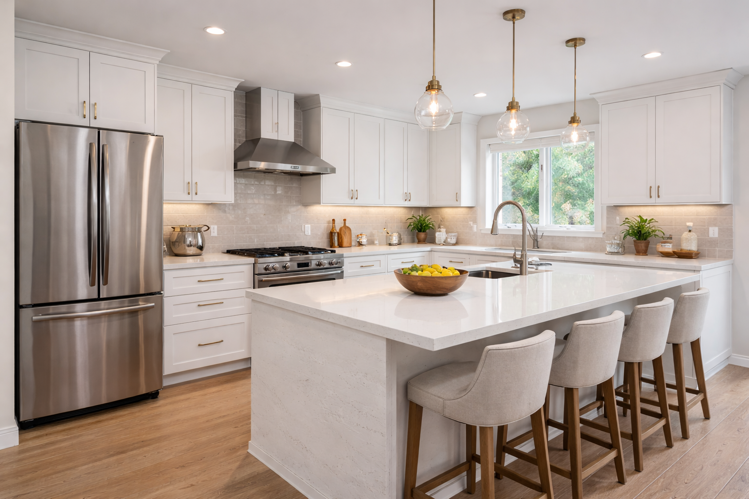 Complete kitchen remodel with custom cabinetry, quartz countertops, and premium appliances.